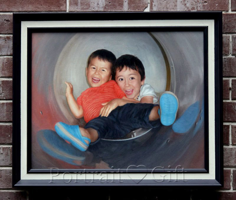 Photo to Oil Painting Request: “This is a birthday present to my husband, his favorite pic of our kid. They are on top of a slide, taken through the slide.”