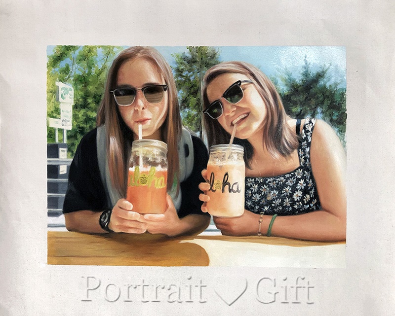 This oil painting is from a photo which shows two girls are drinking juice together happily.