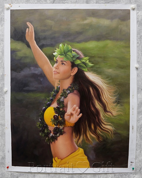 The oil painting is from a photo which showed a woman was opening her hands in the wind.