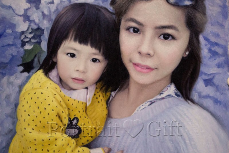 Mother and daughter oil portrait painting – a sweet gift to her little girl. Wish you a happy childhood with your mommy.