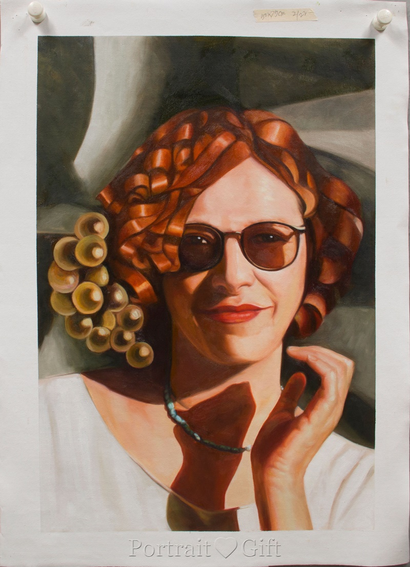 The lady changes her hair into red and curly hair with yellow pearls. She looks more fashionable in the recreated portrait.