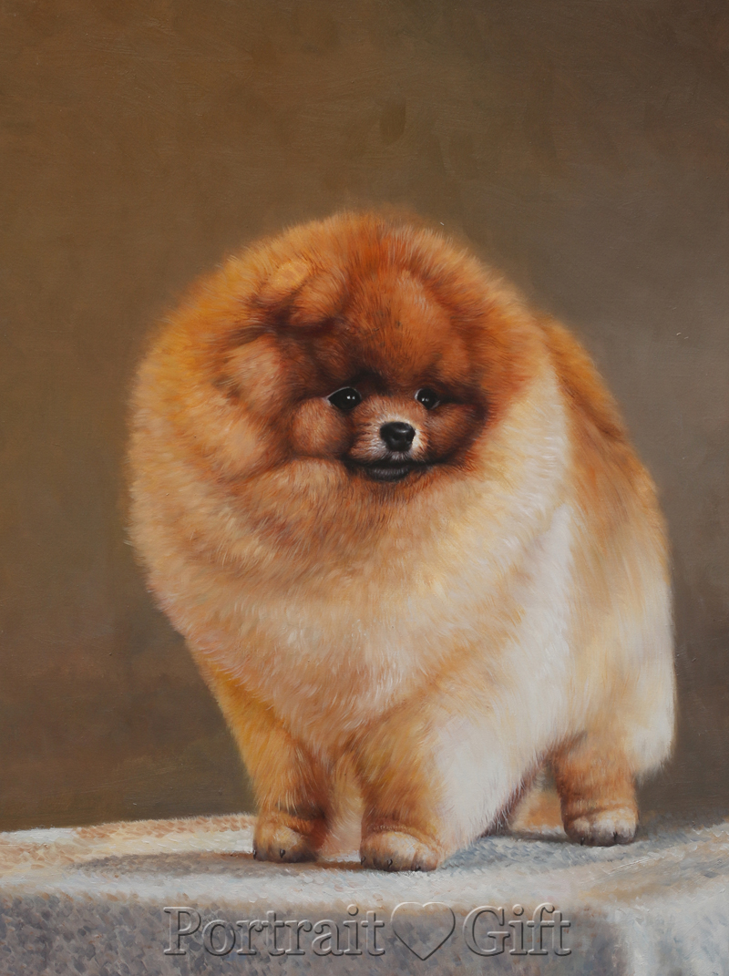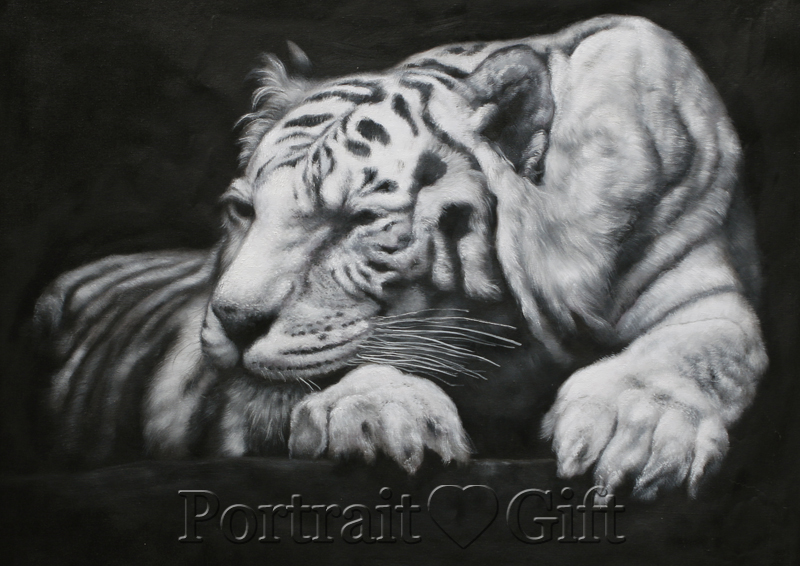 An elegant lady with white dress is sitting on a big chair. In the painting, she smiles sweetly and looks into the right. The blue background matches the subjects perfectly.